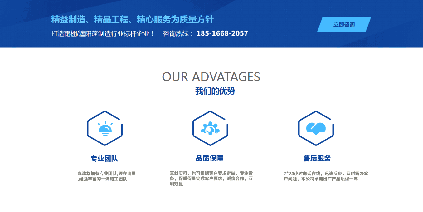 About us鑫建華雨棚有限公司成立于2012年,公司全體勵(lì)精圖治,飛速發(fā)展,已從初創(chuàng)業(yè)公司發(fā)展成為多元化公司,目前公司員工約1000余人,其中擁有中、高級(jí)專業(yè)技術(shù)人員100余人,形成以戶外制造產(chǎn)業(yè)為主,其他第三產(chǎn)業(yè)為輔的多元式經(jīng)營(yíng)模式,旗下設(shè)有鋼結(jié)構(gòu)公司,環(huán)保設(shè)備公司.其鋼結(jié)構(gòu)公司主要以研發(fā),設(shè)計(jì)、生產(chǎn)、營(yíng)銷、安裝、服務(wù)為一體的鋼結(jié)構(gòu)生產(chǎn)制造型企業(yè),環(huán)保設(shè)備公司主要以“綠色環(huán)保節(jié)能“為核心戰(zhàn)略品牌.公司相關(guān)資質(zhì)齊備,主營(yíng)業(yè)務(wù):定制各種推拉蓬、活動(dòng)雨棚、倉(cāng)庫(kù)雨棚、智能電動(dòng)蓬、伸縮電動(dòng)噴漆房、懸空電動(dòng)雨棚等手動(dòng),遙控電動(dòng)一體,系列產(chǎn)品,公司總部位于中國(guó).江蘇,目前,公司年經(jīng)營(yíng)規(guī)模達(dá)8千萬以上,經(jīng)營(yíng)區(qū)減已輻射全國(guó)大部份省會(huì)城市,在雨棚領(lǐng)域展露崢嶸,“鑫建華品牌“已成為國(guó)內(nèi)雨棚,在全國(guó)市場(chǎng)的占有率及品牌均名列前茅. 公司在蘇州、天津、重慶、武漢、濟(jì)南、鄭州、江門、衡陽均設(shè)有工廠,覆蓋全國(guó)主要城市、八倉(cāng)生產(chǎn)制作安裝售后、國(guó)內(nèi)訂單全國(guó)范圍可上門安裝服務(wù)、國(guó)外訂單可派工程師出國(guó)指導(dǎo)安裝....